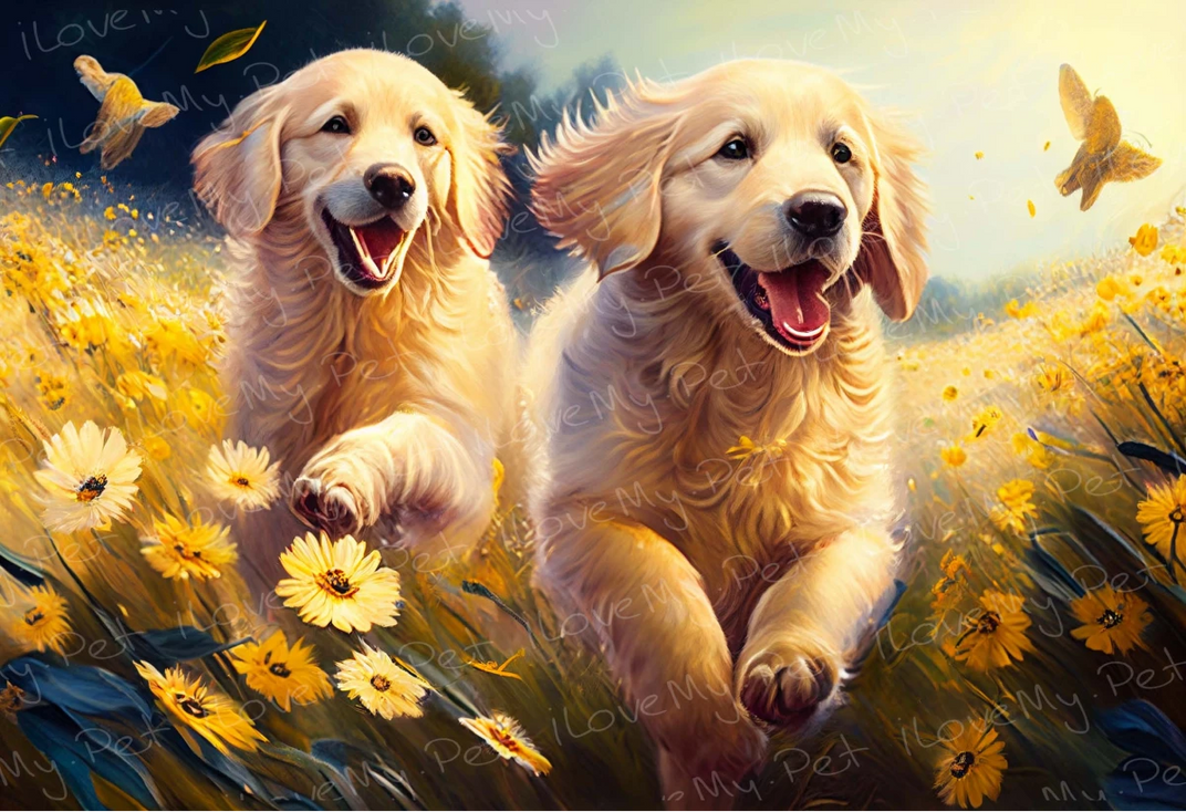 This exquisite piece of art captures the essence of Golden Retrievers, a breed celebrated for its friendly and intelligent nature.