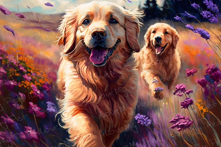 The artwork is an explosion of color, bringing a dreamlike quality to the scene. The Golden Retriever's joyful expression perfectly encapsulates the breed's affectionate and loyal characteristics, making this piece a must-have for any Golden Retriever enthusiast.