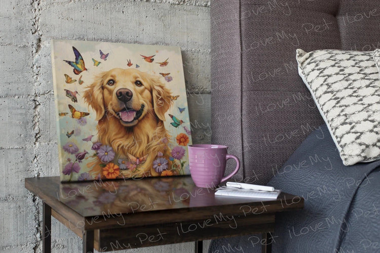 The Golden Retriever Artwork features a Golden Retriever surrounded by butterflies and blooming flowers, symbolizing transformation, hope, and the breed's positive impact on their owners' lives. The affectionate gaze and open-hearted smile of the Golden Retriever are the centrepieces of this artwork, embodying the breed's renowned friendliness and gentle temperament.