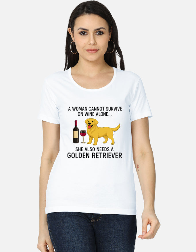 Celebrate the perfect duo of wine and your Golden Retriever with our charming Scoop Neck Cotton T-Shirt! This delightful design captures the essence of a woman who knows she can't live on wine alone - she needs her furry friend by her side.
