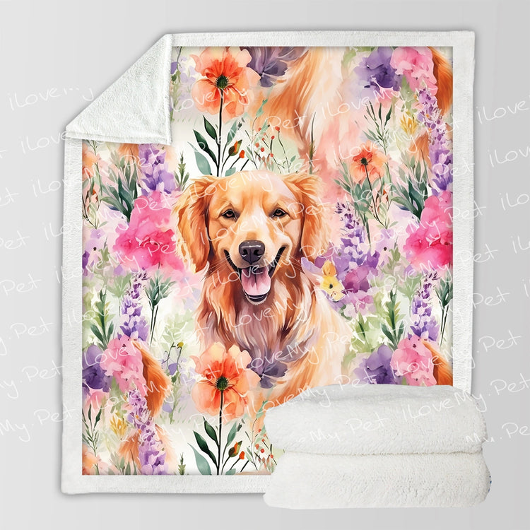 Sleep in the delightful warmth and joyous design of the Golden Retriever in Lavender Bloom Soft Warm Fleece Blanket.