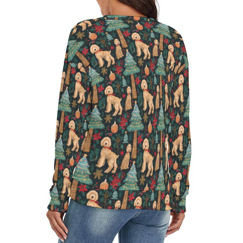 This delightful sweater captures the spirit of Christmas, featuring playful Goldendoodles amidst a backdrop of festive flora and twinkling ornaments.
