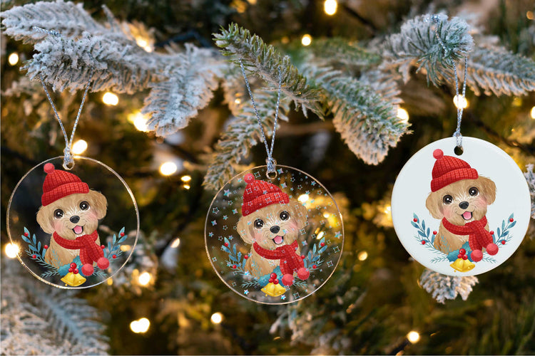 This adorable ornament is available in one delightful design and offers three background options: transparent, transparent with holographic stars, and solid white. Choose the background that suits your holiday decor style and let this charming ornament add a touch of Goldendoodle magic to your tree.