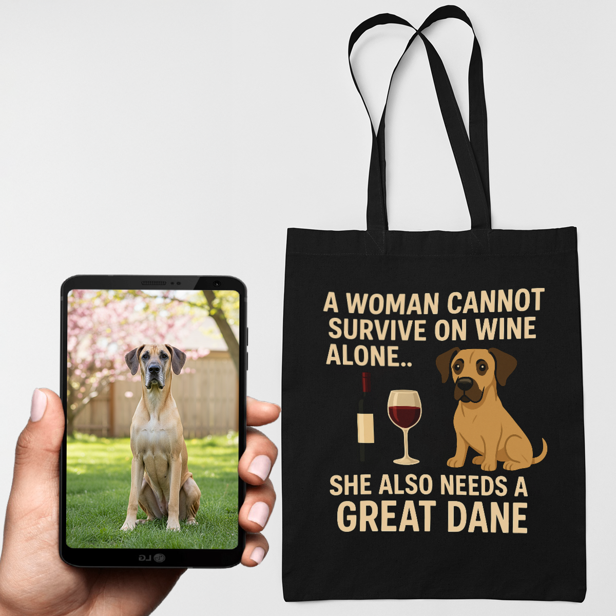 Personalized “A Woman Cannot Survive on Wine…” Custom Great Dane Tote Bags