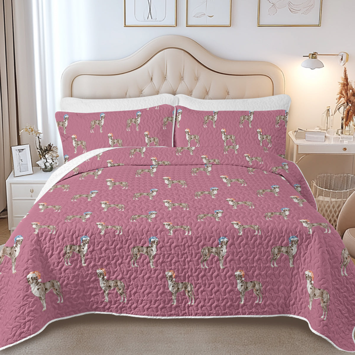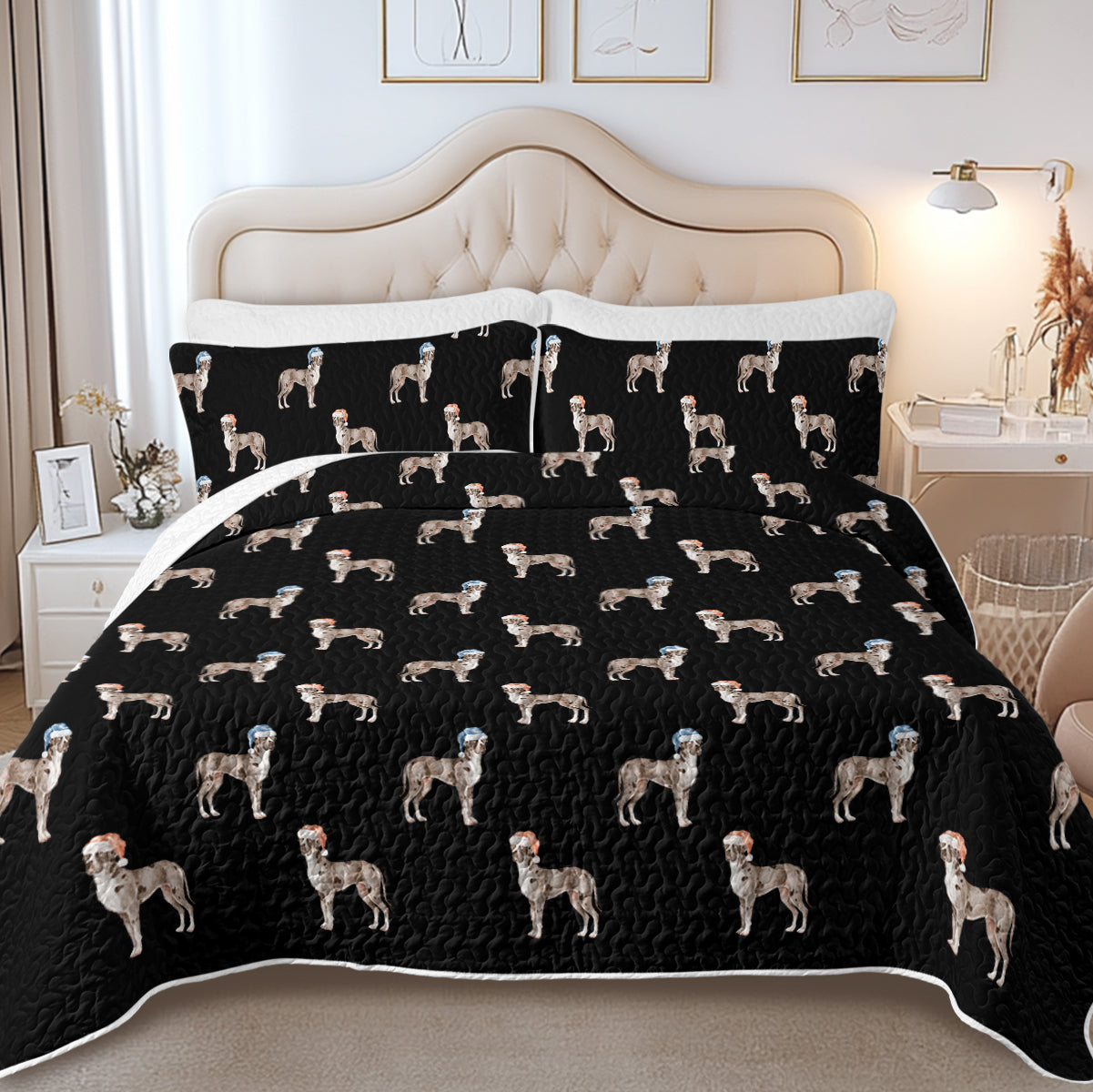 Featuring a beautiful watercolor Christmas pattern of Merle Great Dane, this quilted bedding set is a true masterpiece. The Great Danes are adorned with red and blue Christmas hats.