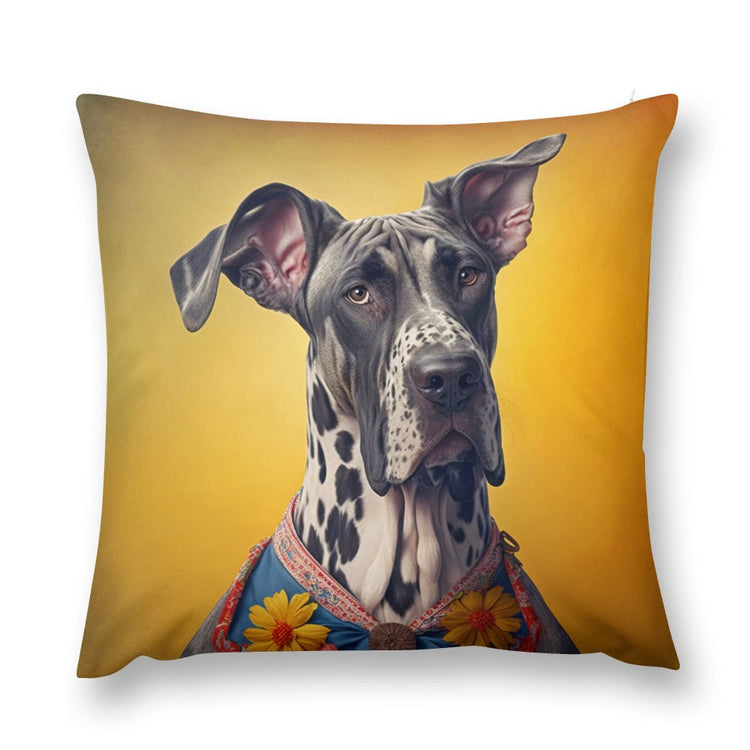 This plush pillow case features a majestic Great Dane, captured in a portrait that harkens back to the opulent days of yore. Adorned in finery that whispers tales of historic grandeur, this noble creature is draped in a garment vibrant with color and rich in detail, evoking the craftsmanship of skilled artisans.