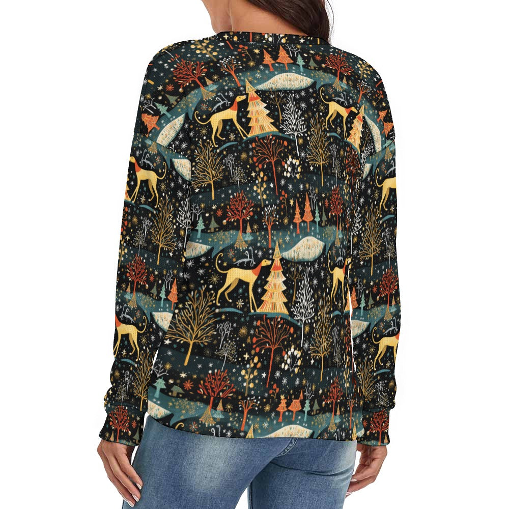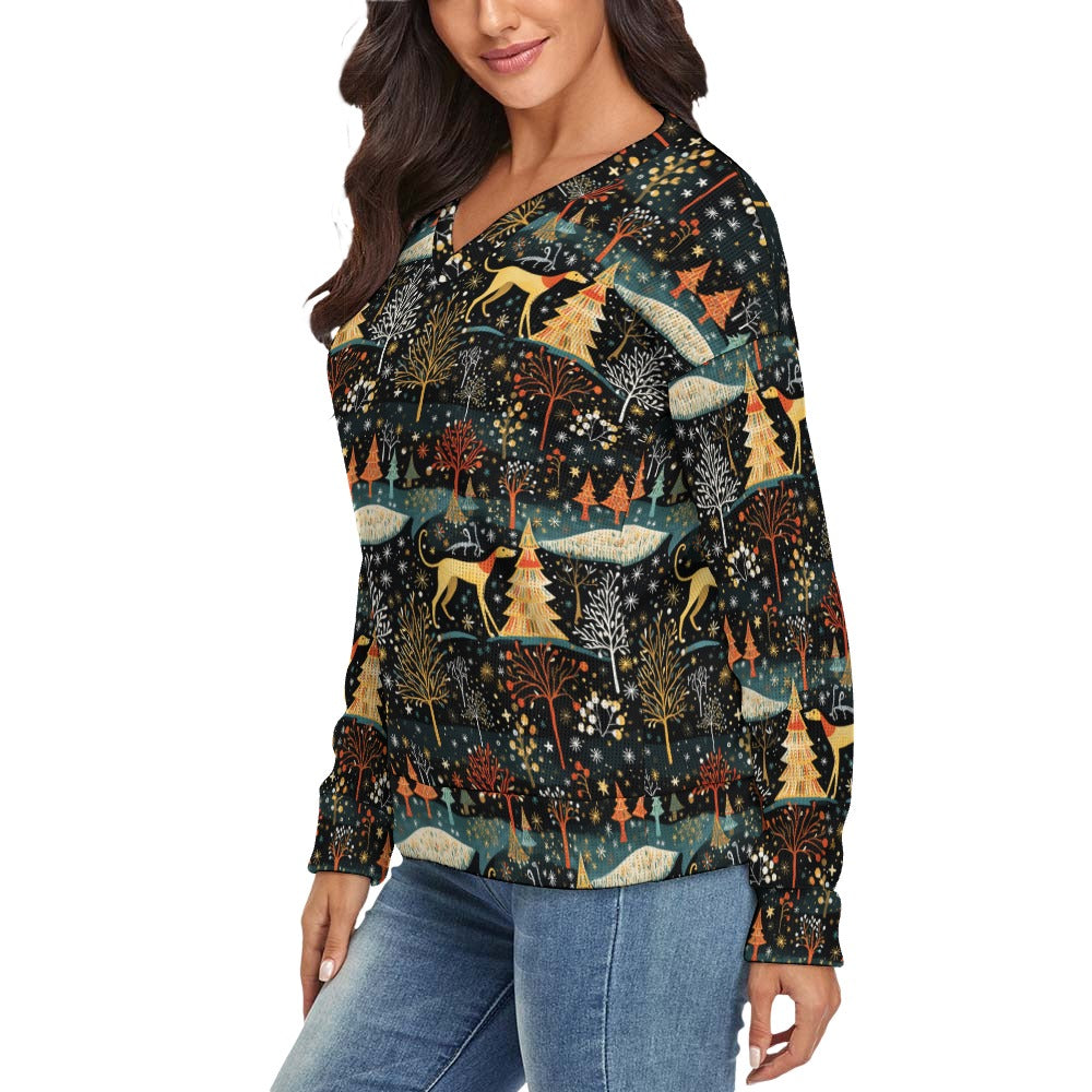 Wrap yourself in the warmth of the season with our Starry Winter Walk Greyhound Women's V-Neck Christmas Sweater.