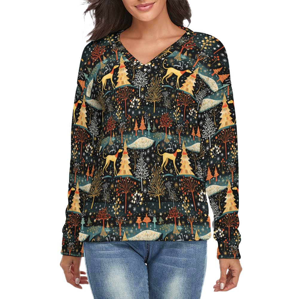 Starry Winter Walk Greyhound Women's V-Neck Christmas Sweater