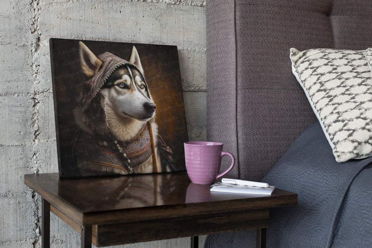 The poster features a Husky adorned in traditional attire, echoing the rich heritage of the Siberian Eskimo culture. Its piercing blue eyes and striking mask-like facial markings are a testament to the breed's noble spirit and the harsh climes of its native land.