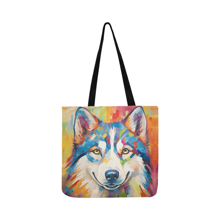 This tote bag features a stunning mosaic of colors that encapsulate the soulful eyes, dynamic energy, and multifaceted personality of the beloved Husky breed. At the core of this artwork is the wise and mischievous gaze of a Husky, depicted through an array of geometric color blocks.