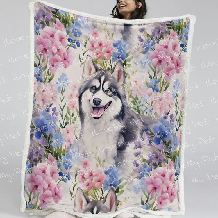 Depicting a serene painting of a Siberian Husky adorned with pastel-colored flowers, this blanket beautifully captures the dog's innate intelligence and stunning beauty. With each flower adding a splash of vibrancy, the artwork is a visual symphony that celebrates the unique traits of this lovable breed.