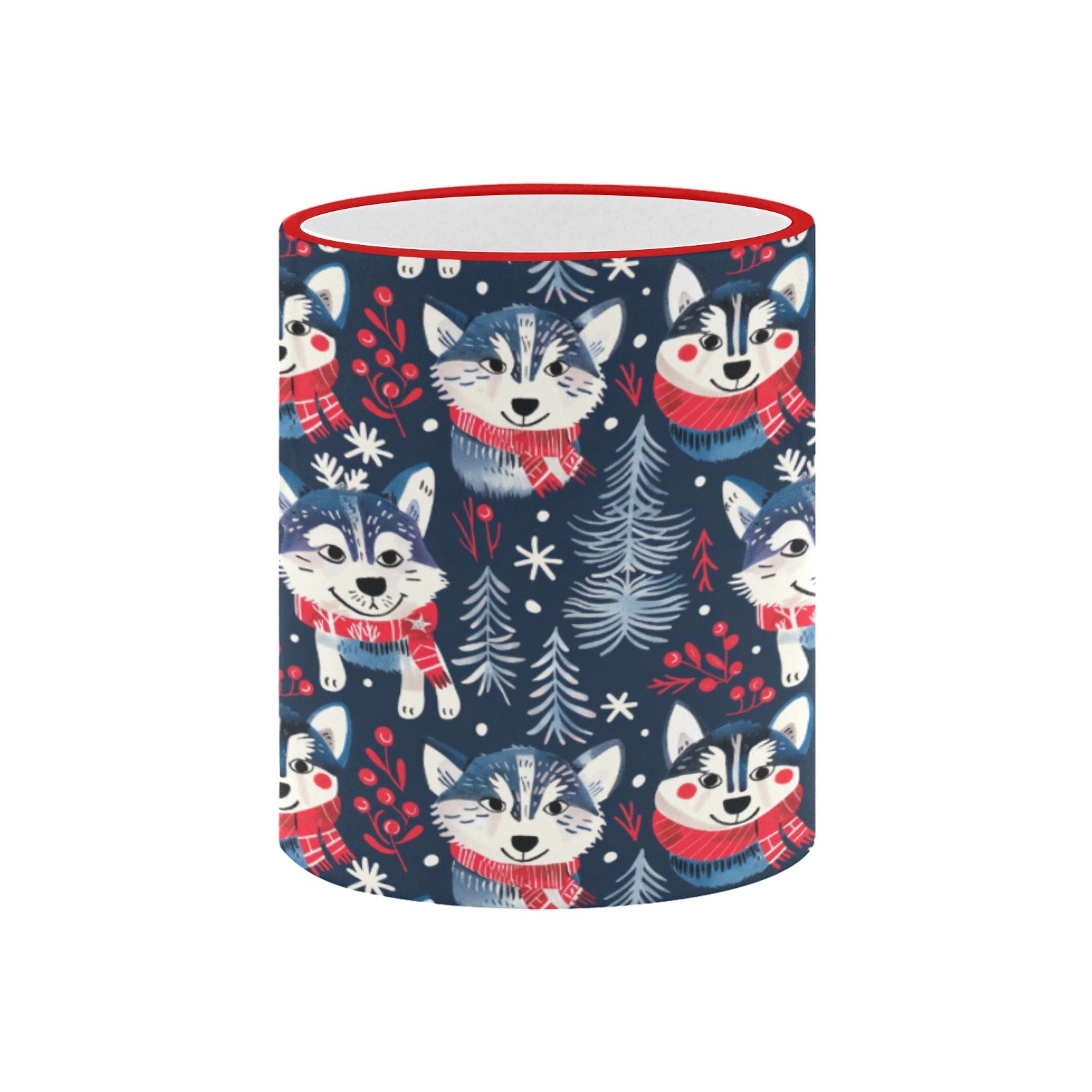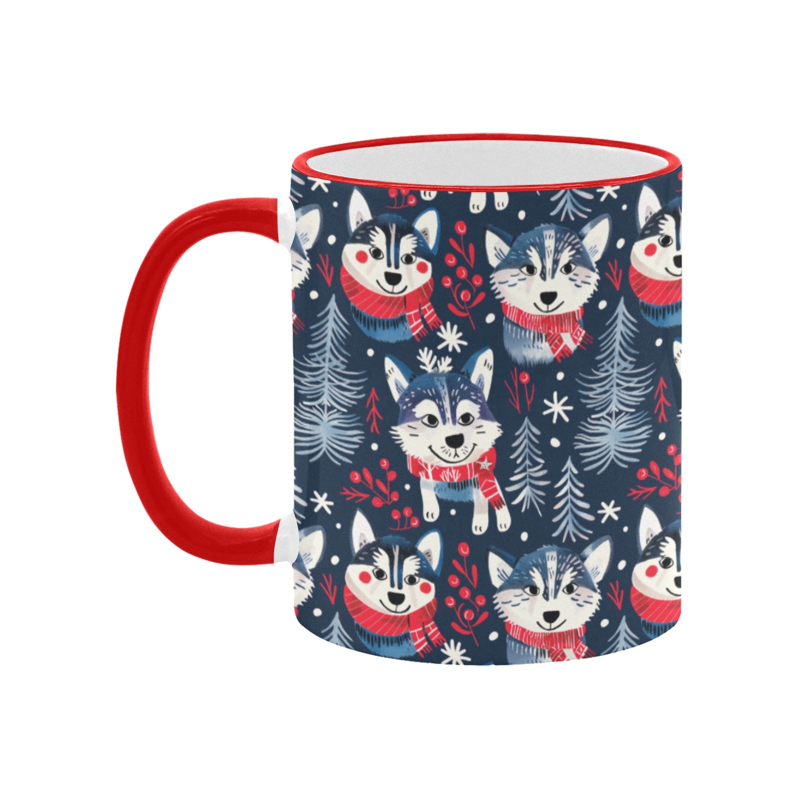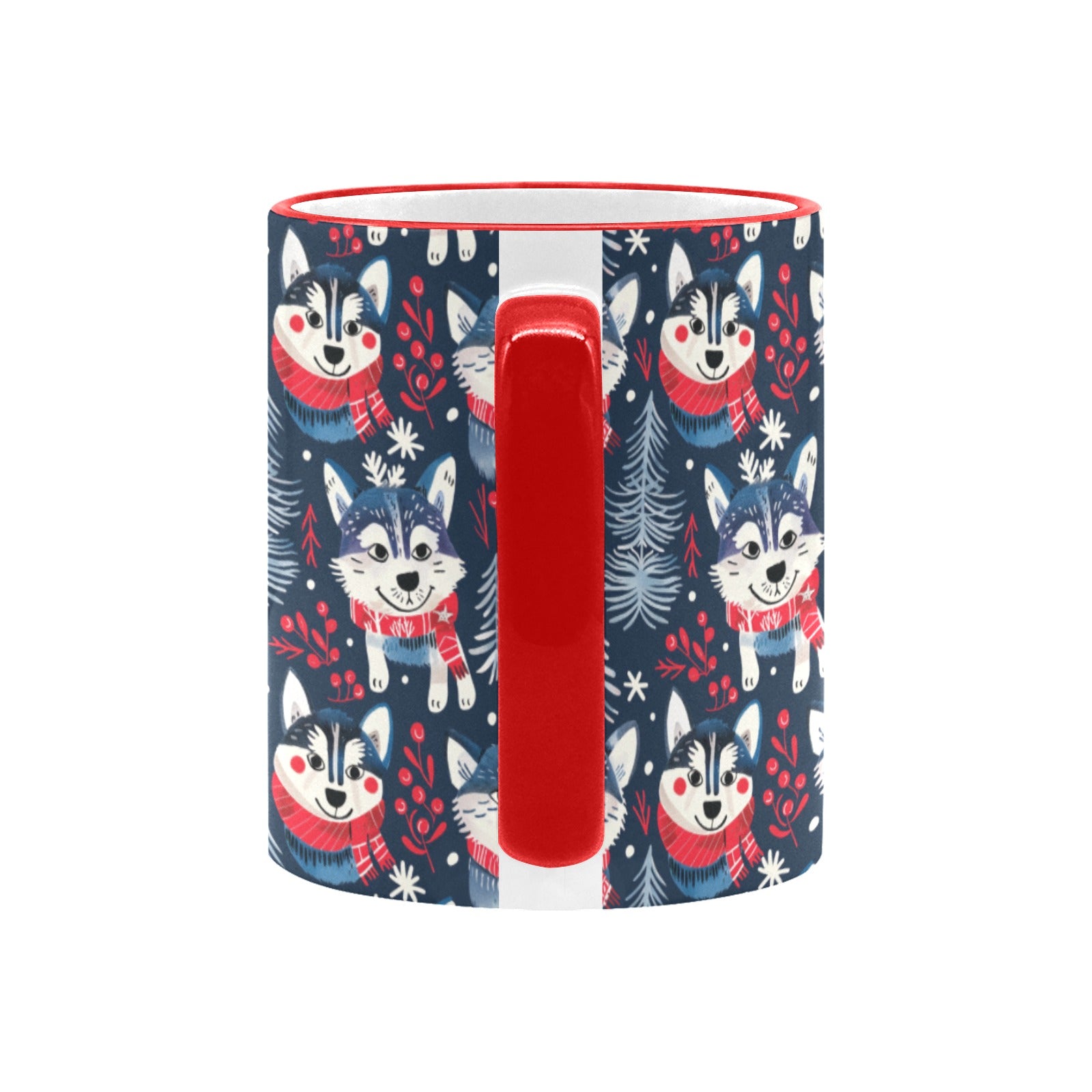 This enchanting mug features playful Siberian Huskies, adorned in festive red scarves, bringing warmth and cheer to your daily rituals.