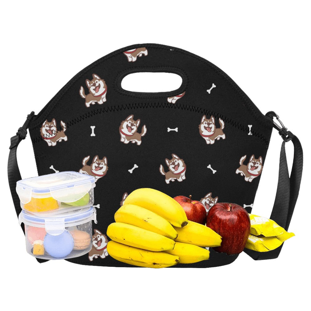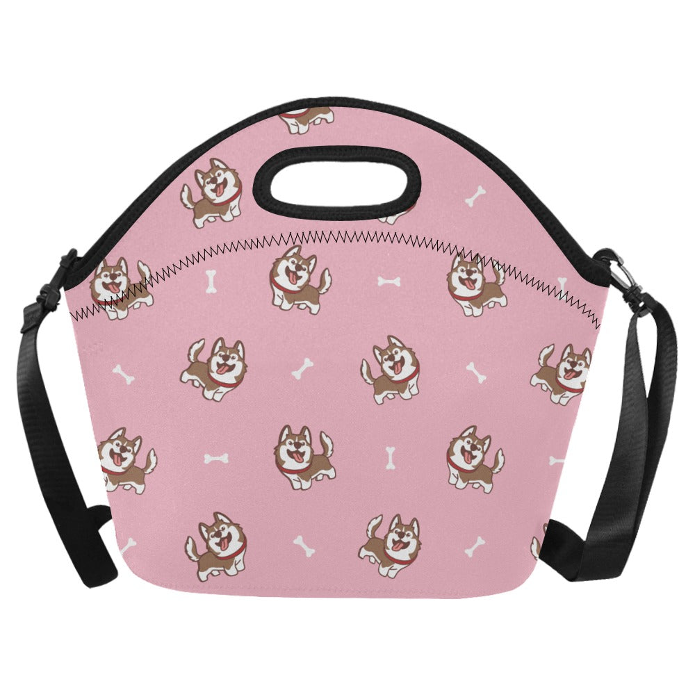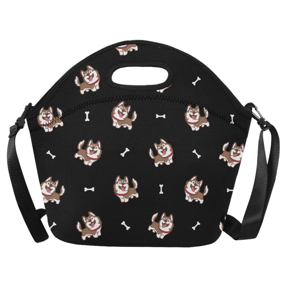 Celebrate your love for Huskies with our charming Brown Husky Love Neoprene Lunch Bag! This delightful bag features adorable cartoon-style brown and white Huskies, each with cheerful expressions and fluffy fur, making it a perfect companion for your meals.