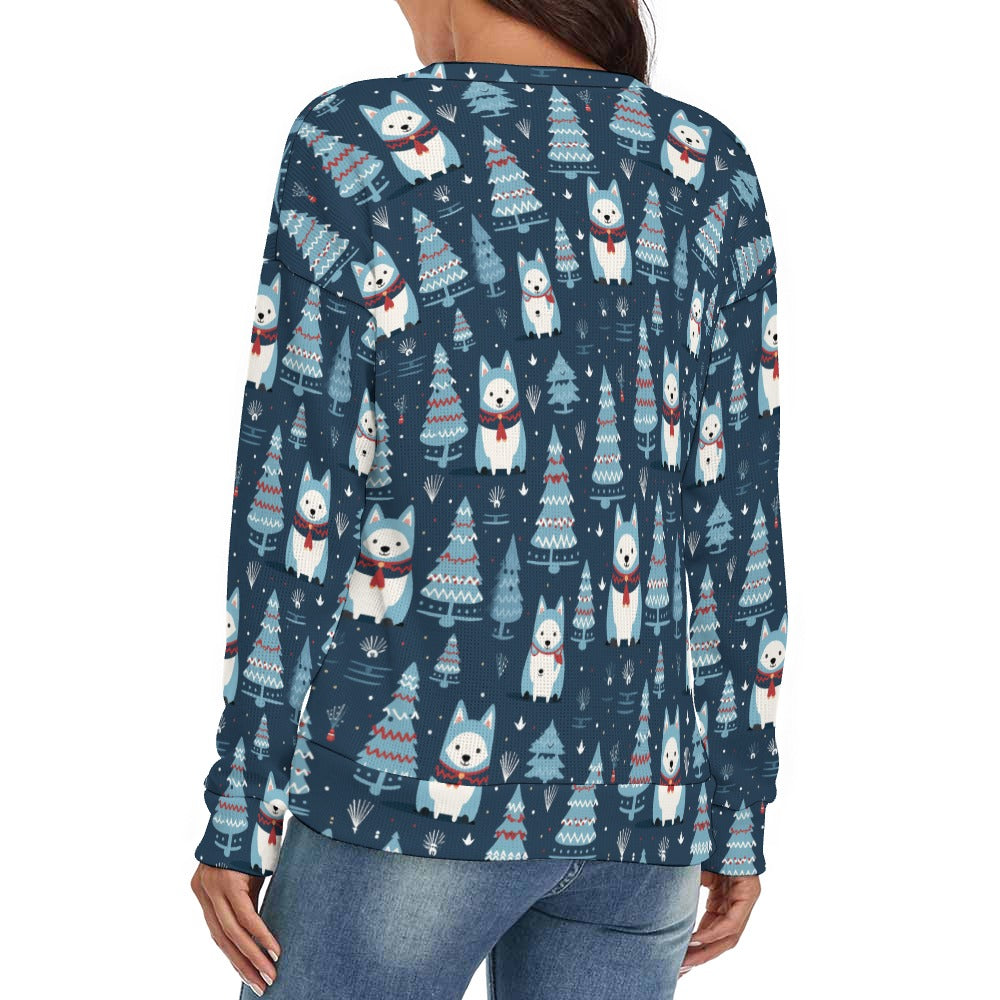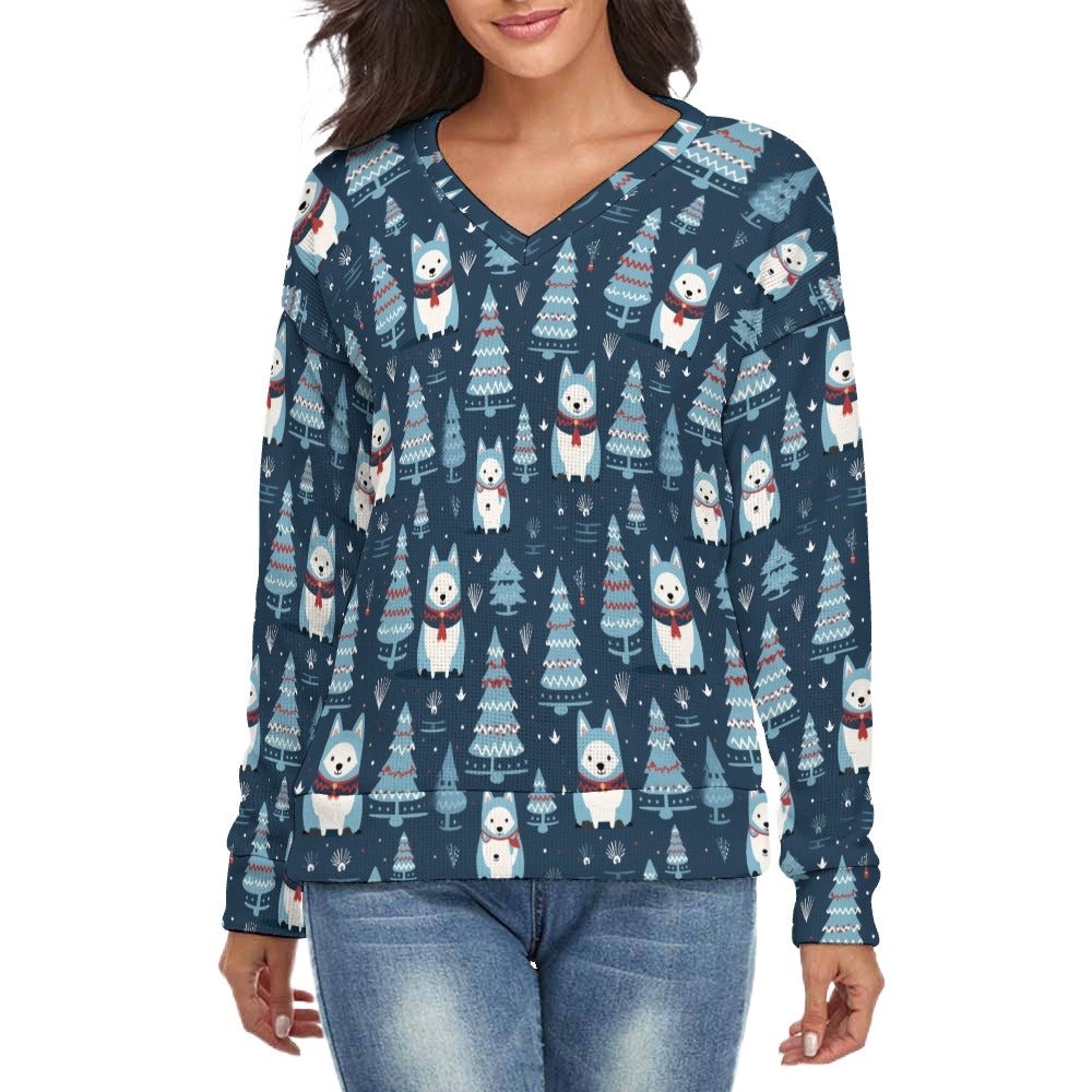 Embrace the spirit of the season with our Winter Wonderland Husky Women's V-Neck Christmas Sweater, a perfect blend of warmth and festive cheer.