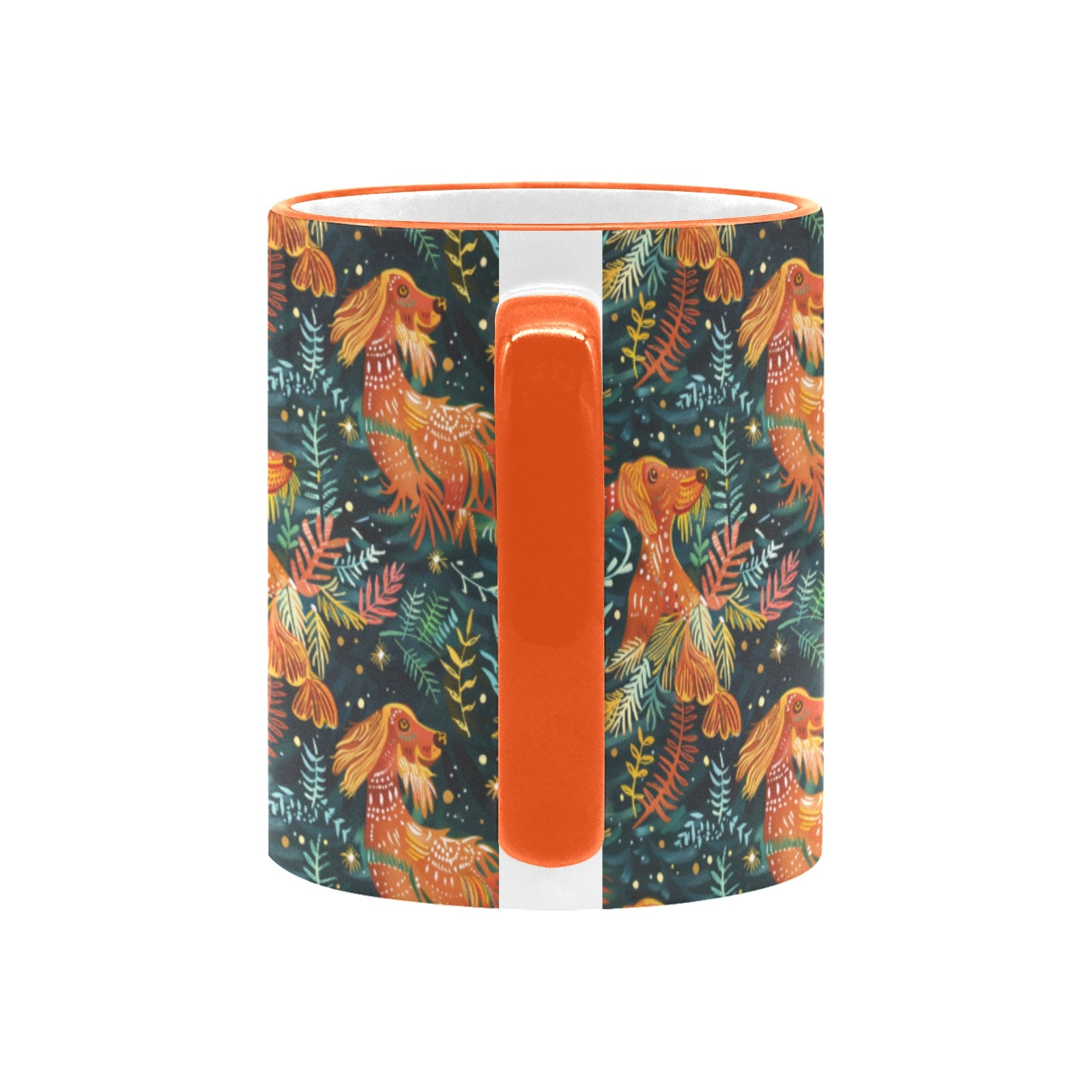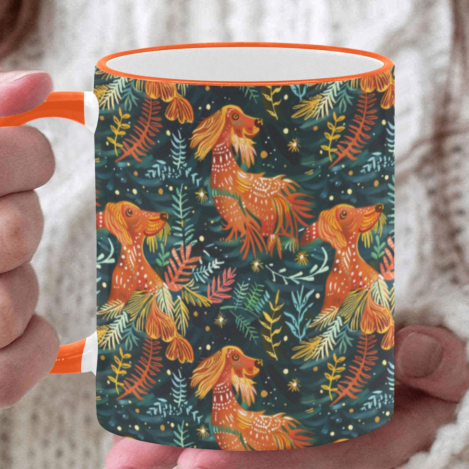 This beautifully crafted mug features a stunning depiction of Irish Setters gracefully navigating a magical forest under a starry sky.
