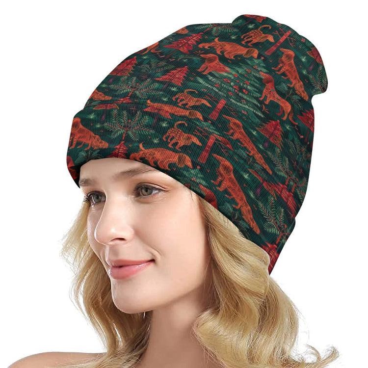 This beanie showcases a rich tapestry of Irish Setters against a deep evergreen forest scene, capturing the timeless spirit of the holidays. The elegant forms of the setters, with their rich mahogany coats, stand out beautifully against the dark background.