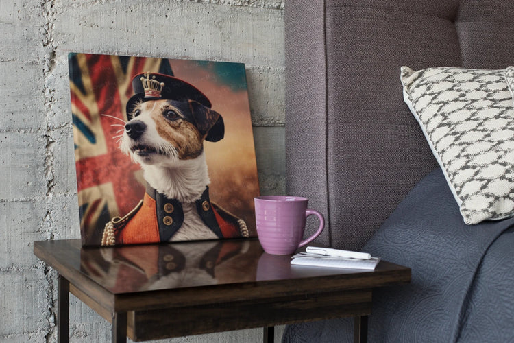 This striking artwork portrays a Jack Russell Terrier, a breed celebrated for its energetic spirit and sharp wit, adorned in a traditional British military uniform. It captures the essence of a seasoned officer with the Jack Russell standing proudly, clad in the iconic red coat of British soldiers, rich in color and symbolic of the empire's military might.