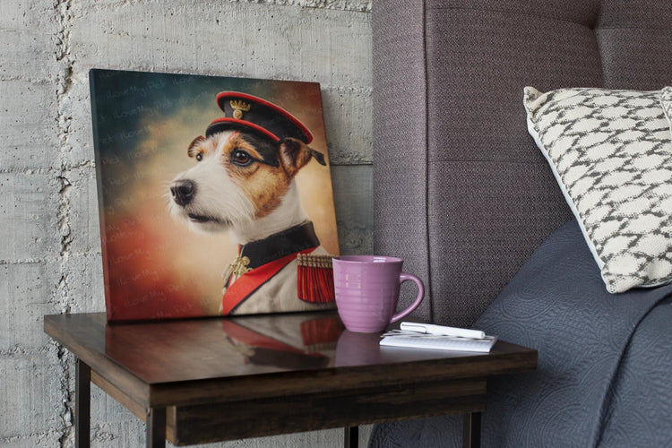 This unique wall art poster presents a whimsical portrayal of nobility and valor, featuring a Jack Russell Terrier adorned in a traditional British military uniform. The vibrant portrayal captures the boundless energy and spirited disposition of the breed, set against a backdrop of historical grandeur.