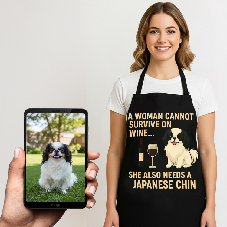 Celebrate your love for your Japanese Chin with our Personalized “A Woman Cannot Survive on Wine Alone… She Also Needs a Japanese Chin” Custom Dog Apron. This unique apron is perfect for dog lovers who enjoy cooking or entertaining while showcasing their bond with their furry friend.