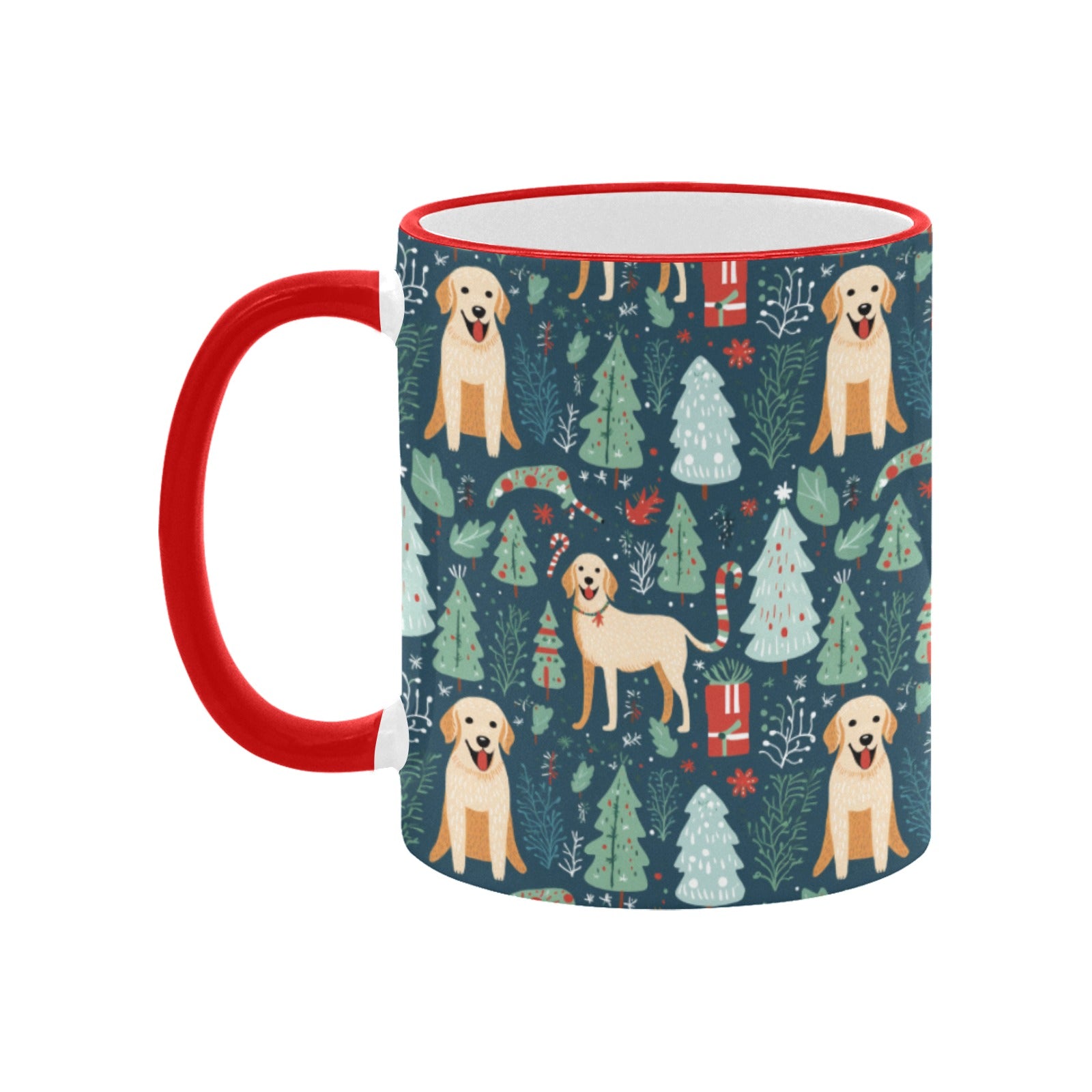This delightful mug features cheerful Labrador Retrievers surrounded by whimsical Christmas trees and gifts, bringing warmth and happiness to your holiday gatherings.
