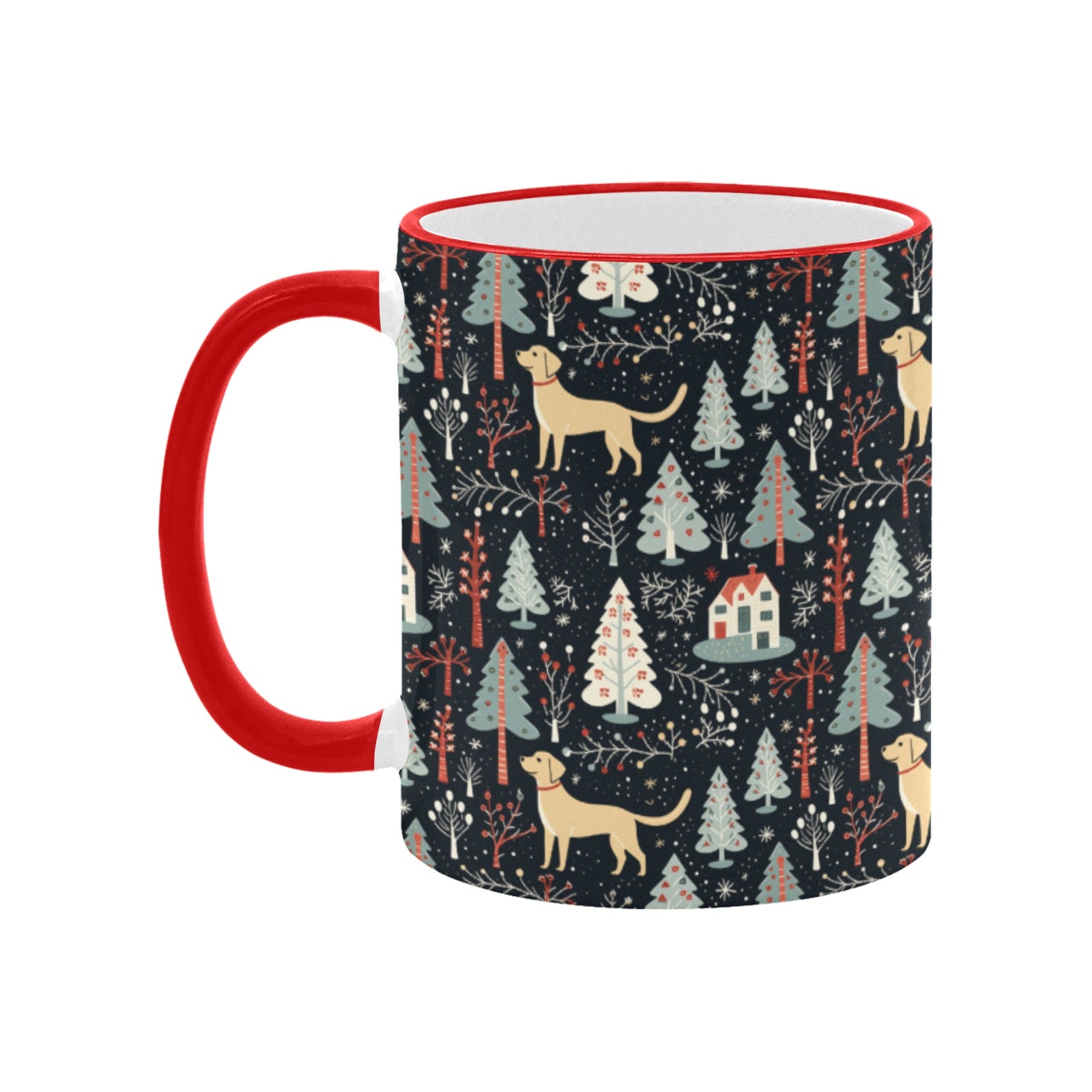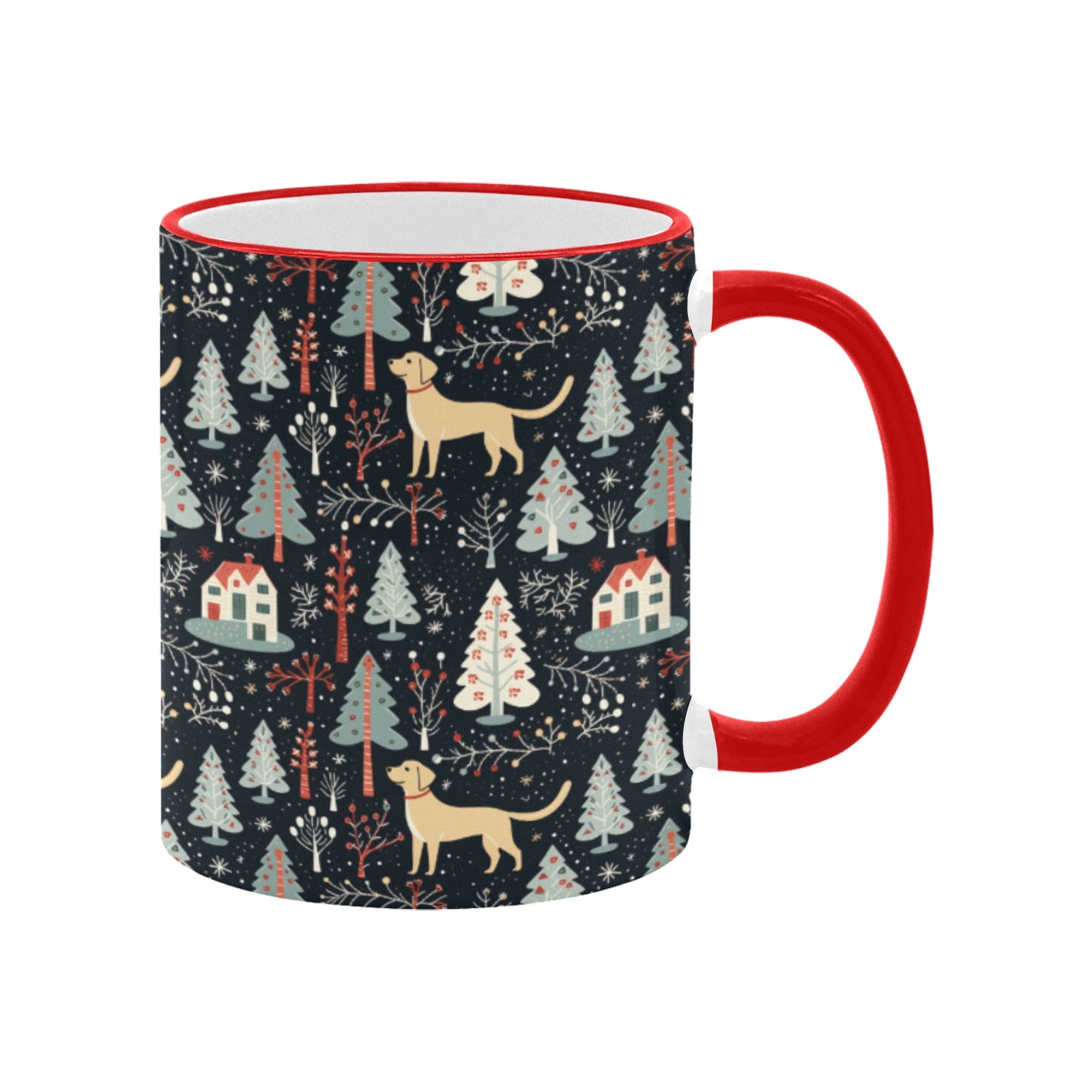 With its whimsical art style reminiscent of classic Christmas cards, this mug captures the joyful essence of the season. The soft shades of cream and gold Labs against a rich, dark background create a stunning contrast that will bring a smile to your face.