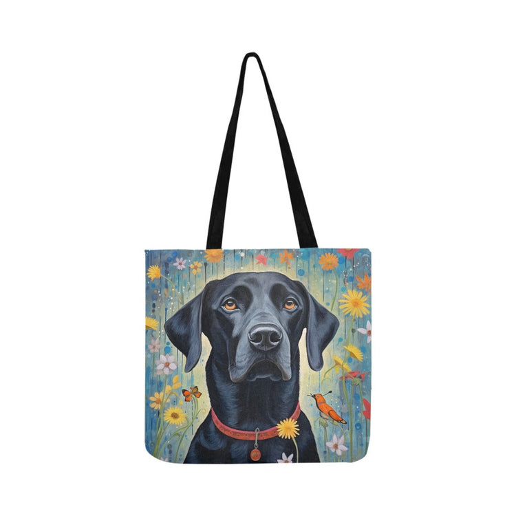This exquisite tote features "Black Labrador's Floral Embrace", a captivating artwork that beautifully portrays the Black Labrador Retriever, a breed celebrated for its loyalty, affection, and joyful disposition.