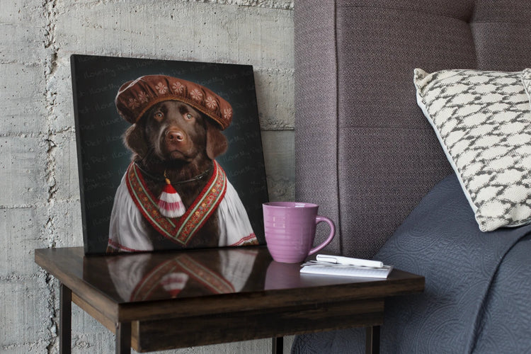 Witness the fusion of art, history, and canine grace in this exquisite portrayal of a Chocolate Labrador adorned in traditional Newfoundland attire.