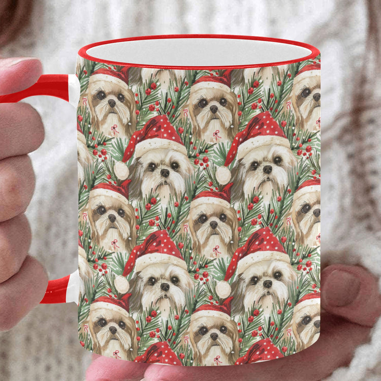 This charming mug features delightful Lhasa Apsos adorned in festive hats, bringing warmth and joy to your daily coffee or tea ritual.