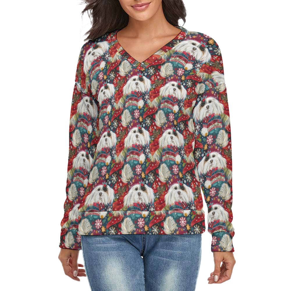 Holiday Splendor Lhasa Apsos Women's V-Neck Christmas Sweater