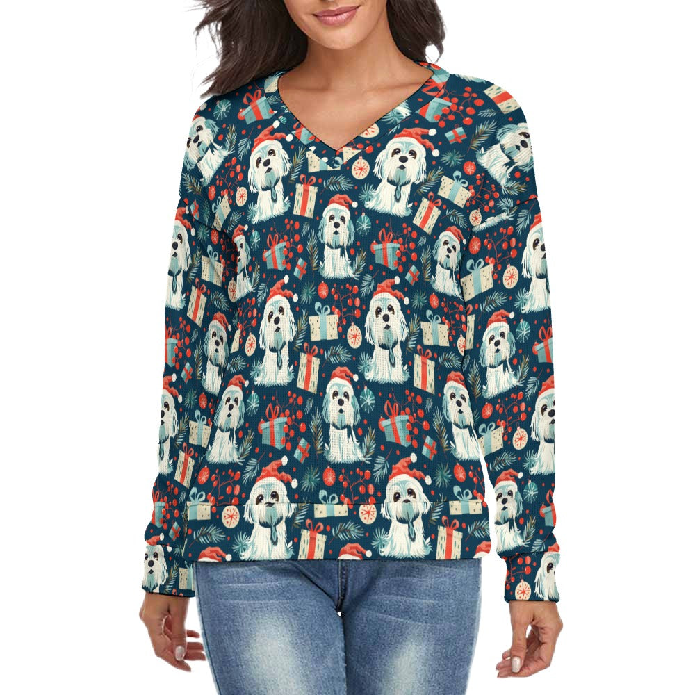 Santa Paws Parade Lhasa Apso Women's V-Neck Christmas Sweater