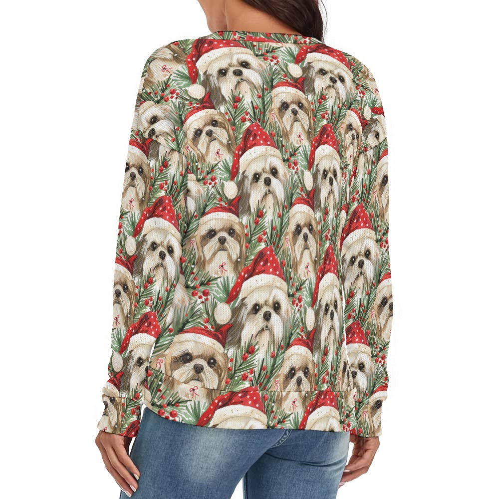 This charming sweater features delightful depictions of Lhasa Apsos, bringing the magic of Christmas to life.