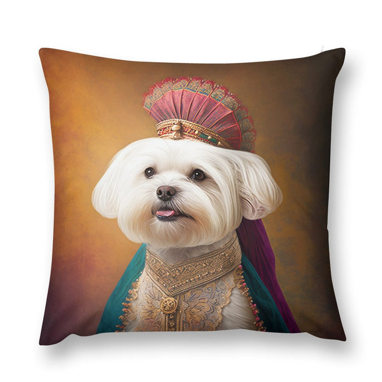 This plush pillow case features a whimsical yet respectful homage to the cultural heritage of India, showcasing a charming Maltese adorned in the traditional attire of an Indian Maharaja.