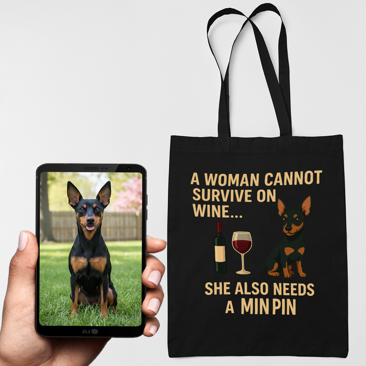 Personalized “A Woman Cannot Survive on Wine…” Custom Miniature Pinscher Tote Bags