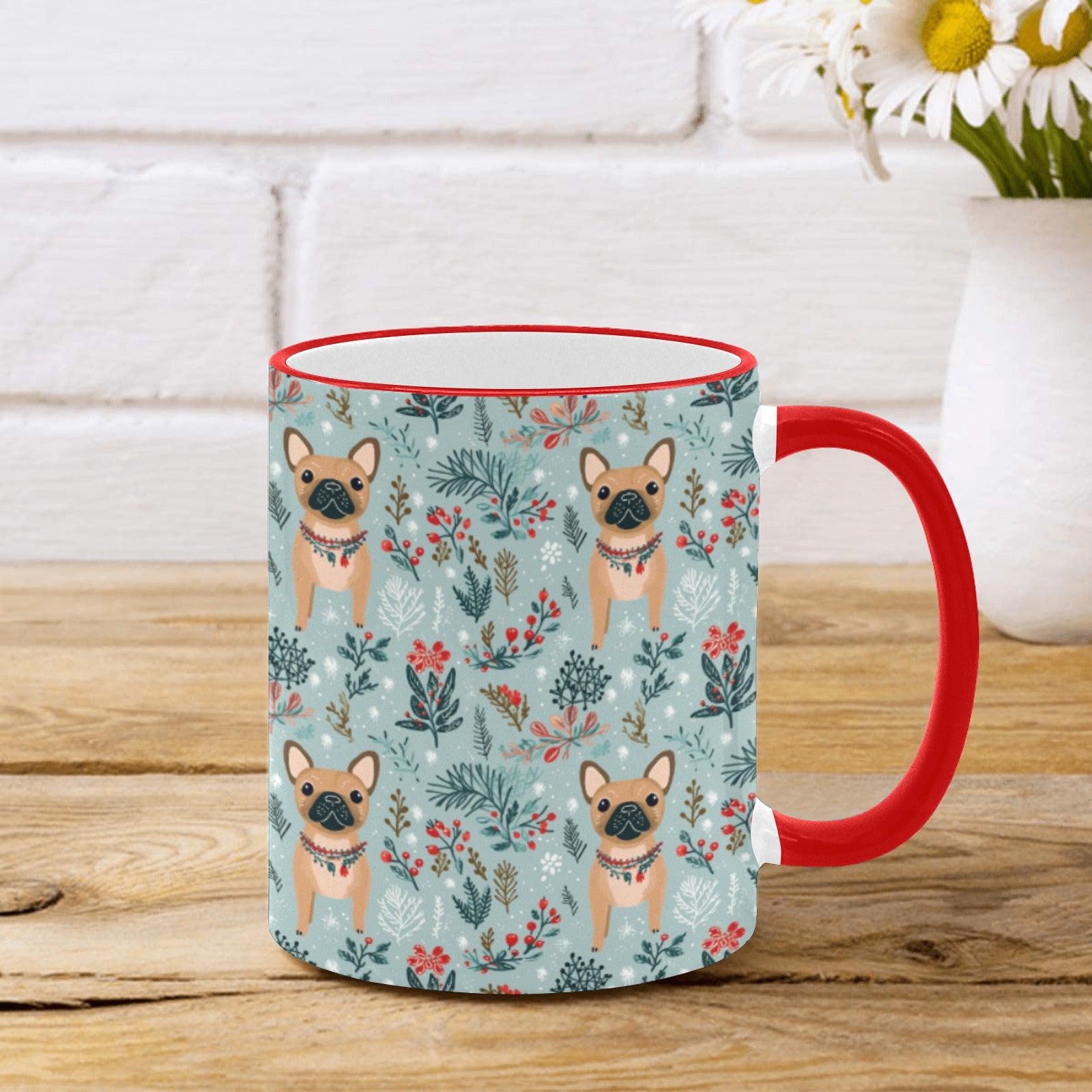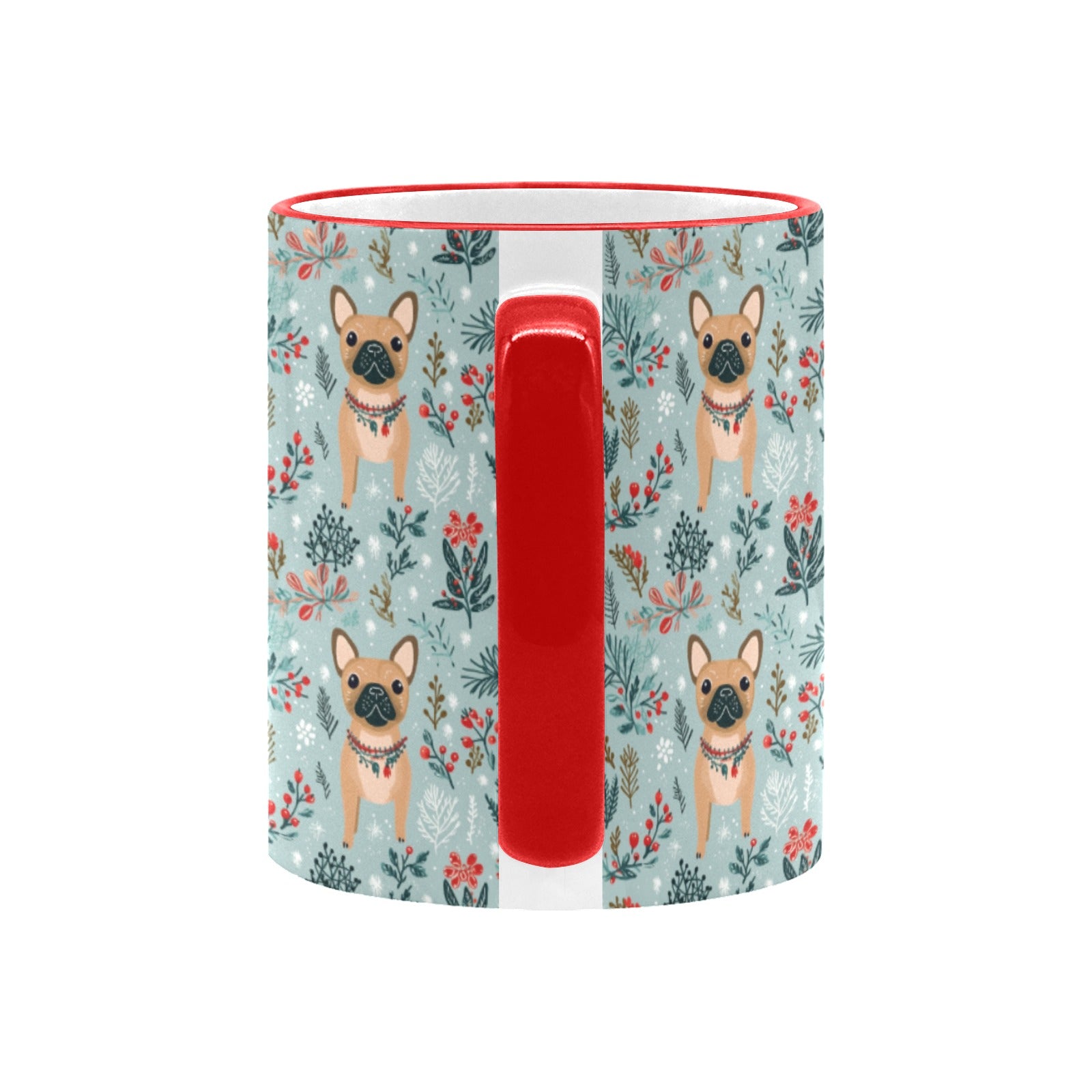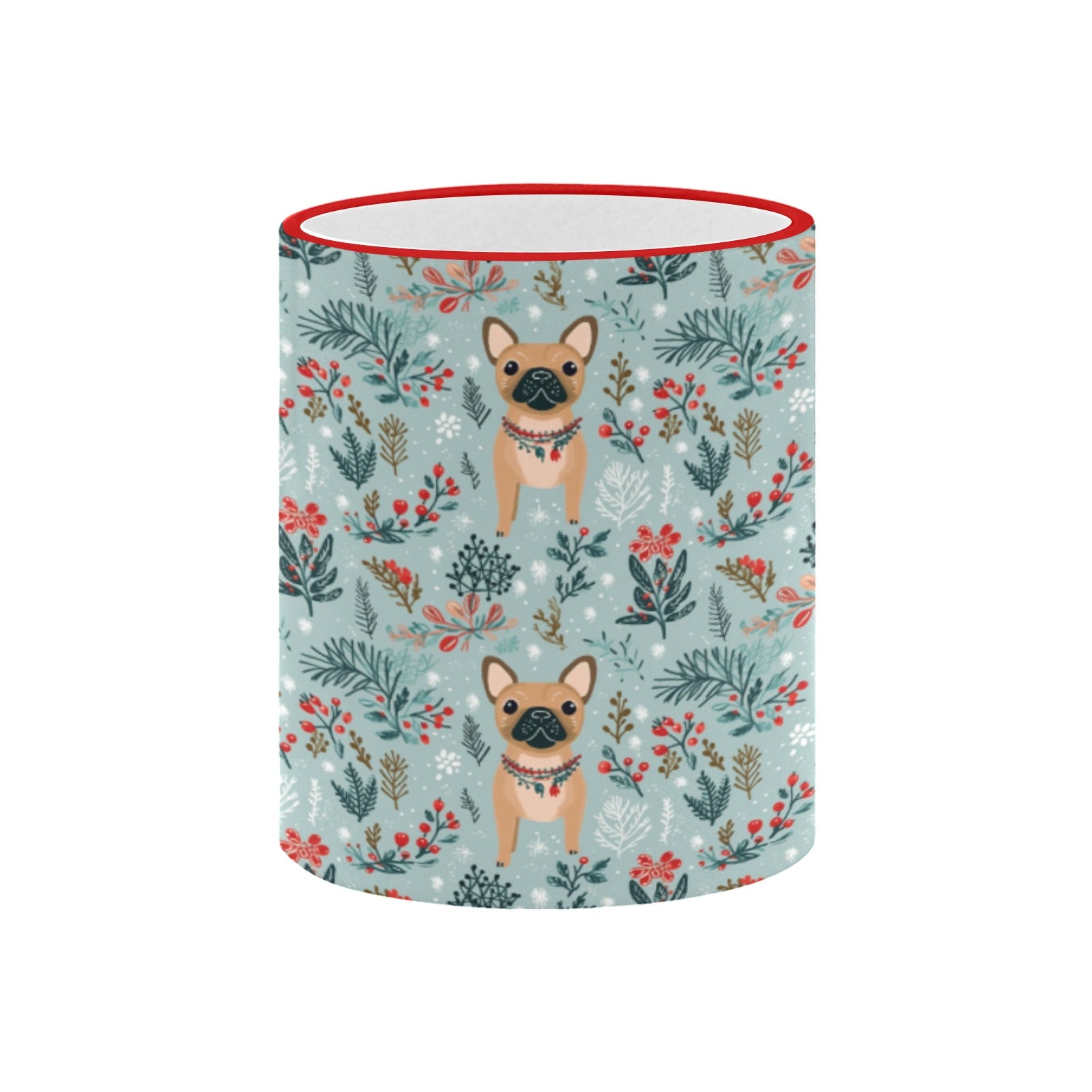 Adorned with festive necklaces, these charming Frenchies bring warmth and cheer to every sip. The soft pastel blue background, paired with vibrant reds, greens, and whites, creates a chic sanctuary for dog lovers.