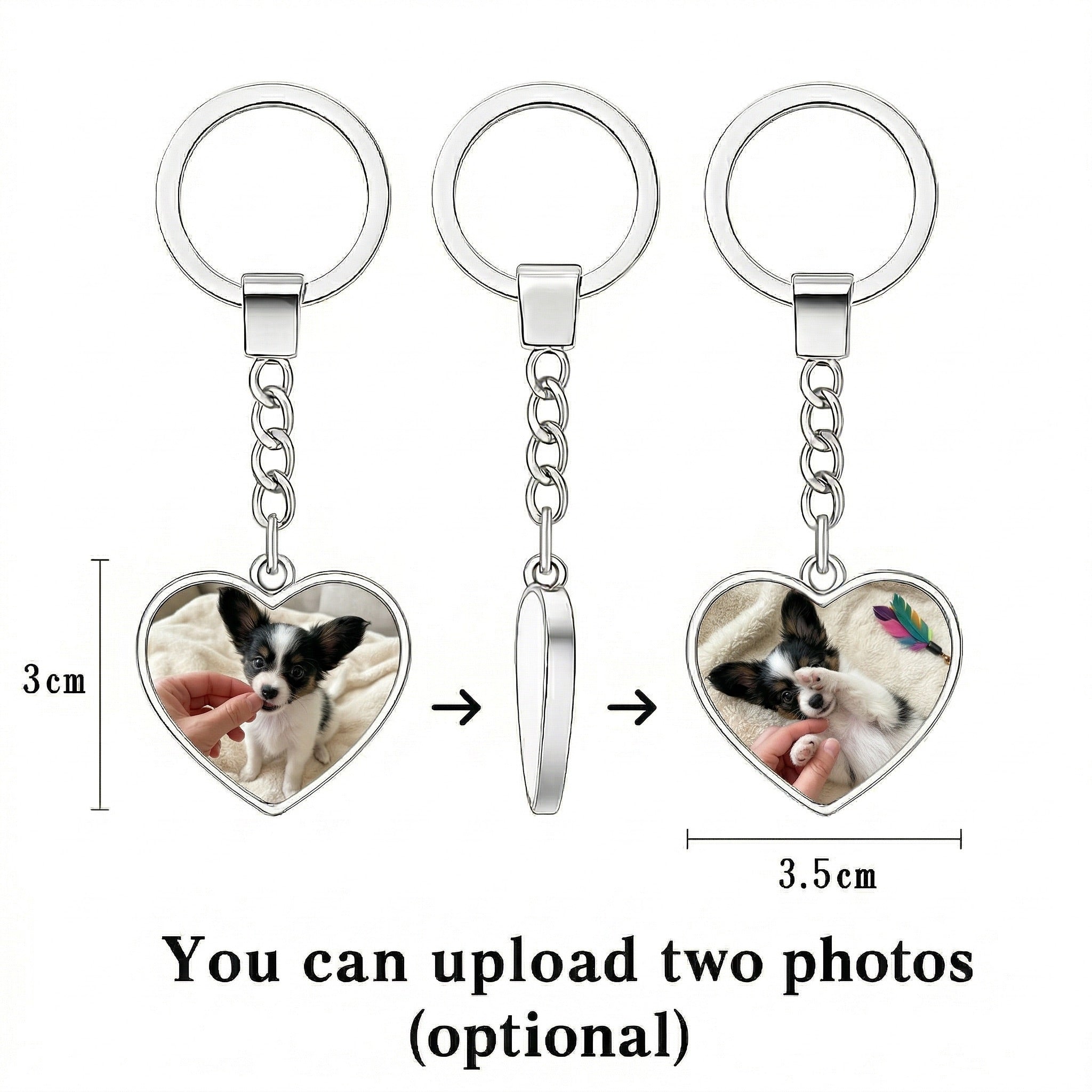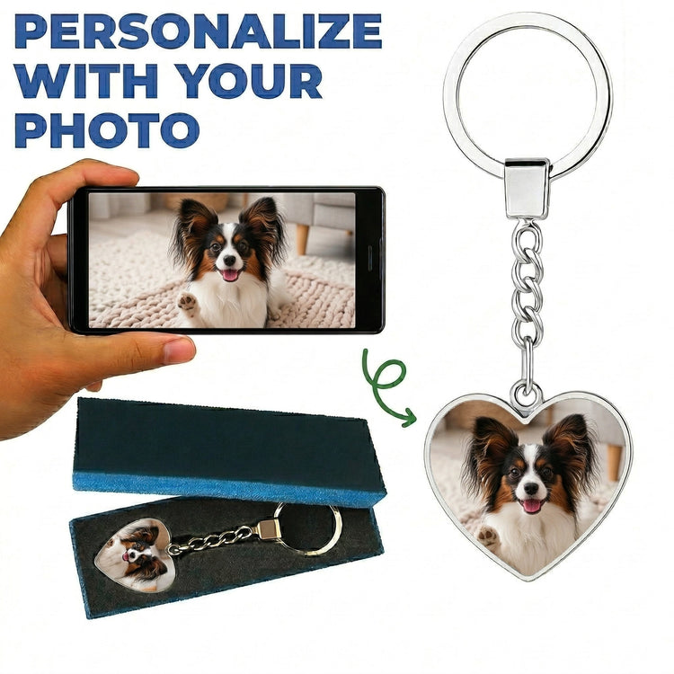 Carry Papillon love everywhere with this personalized, heart-shaped, double-sided glass keychain from iLoveMy.Pet.