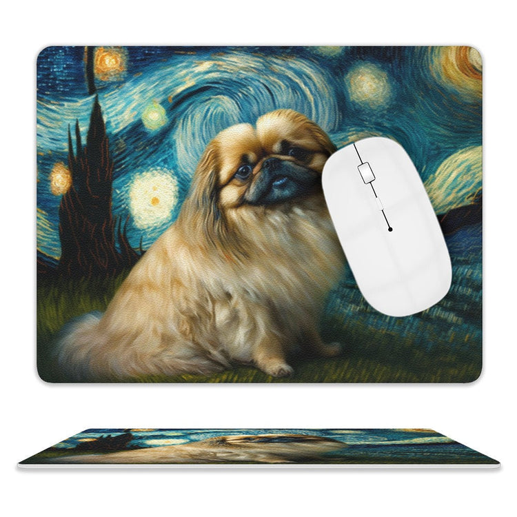 This unique mouse pad features the regal Pekingese breed against the mesmerizing backdrop of Vincent van Gogh's "The Starry Night," creating a piece that's both functional and a tribute to fine art and canine charm.