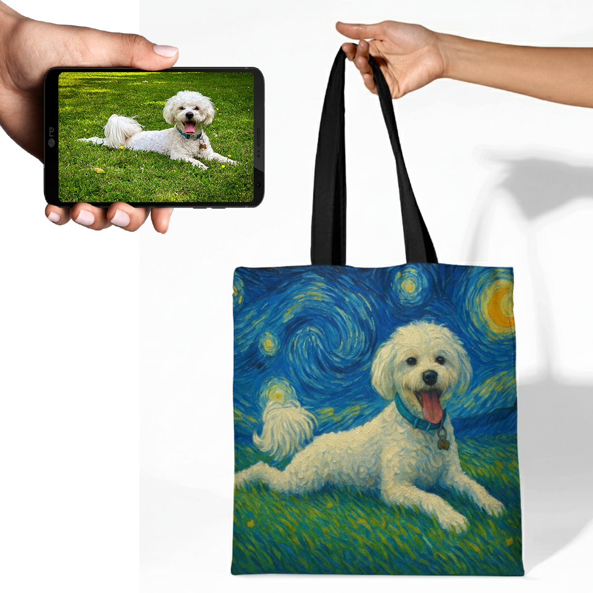 Celebrate your love for your Bichon Frise with our Personalized Starry Night Artwork Canvas Tote Bags! These unique bags are perfect for dog lovers who want to carry a piece of their furry friend wherever they go.