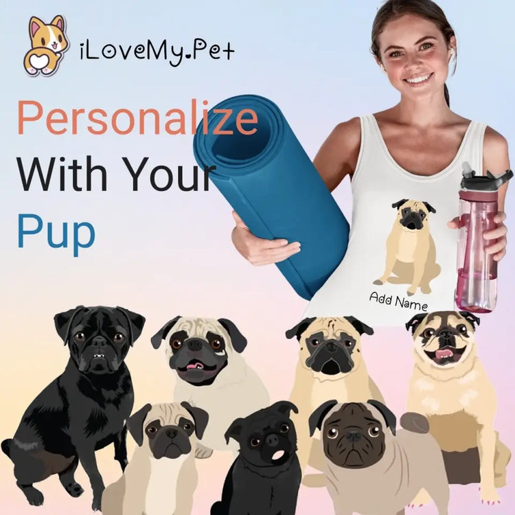 Flaunt your Pug loving personality with this customizable tank top, featuring options to personalize with your Pug's coat color and name.