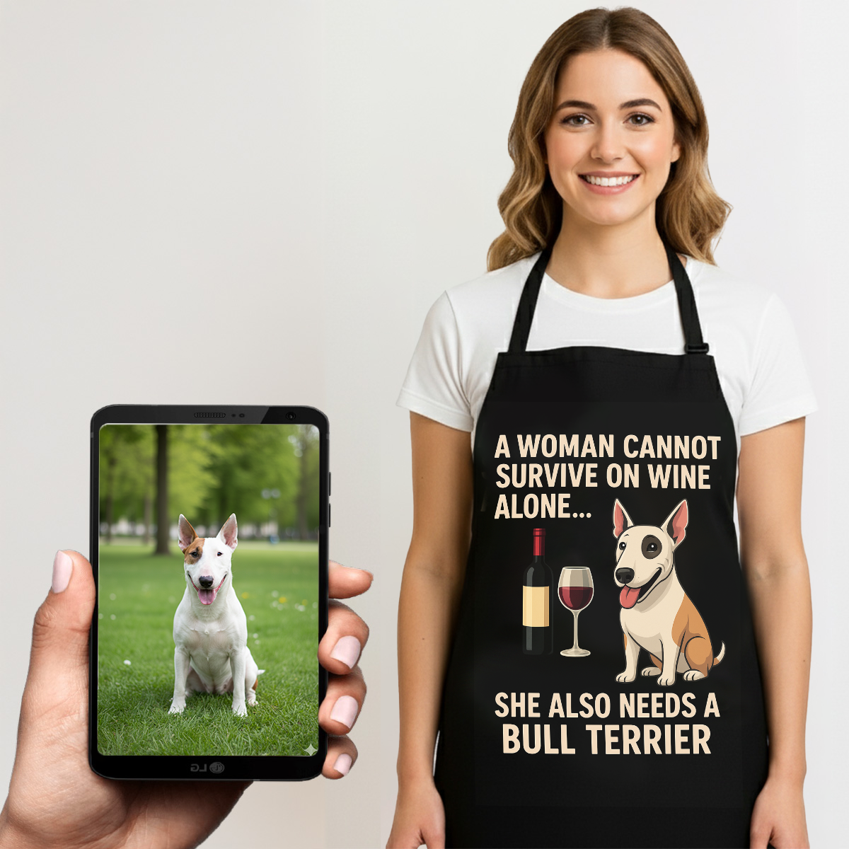 Celebrate your love for wine and your Bull Terrier with our Personalized “A Woman Cannot Survive on Wine Alone… She Also Needs a Bull Terrier” Custom Dog Apron. This unique apron is perfect for dog lovers who enjoy cooking or entertaining while showcasing their bond with their furry friend.
