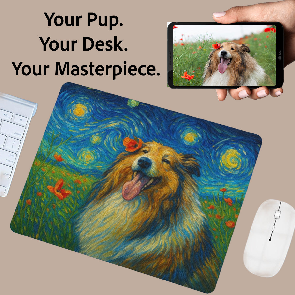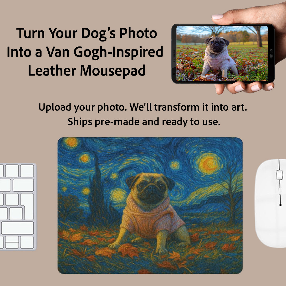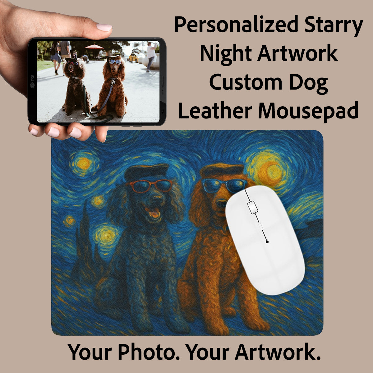 Starry Night Style Custom Artwork: Upload a photo of your dog and receive a unique Van Gogh-inspired digital portrait printed directly onto a leather mousepad ā making your desk setup as expressive as it is personal.
