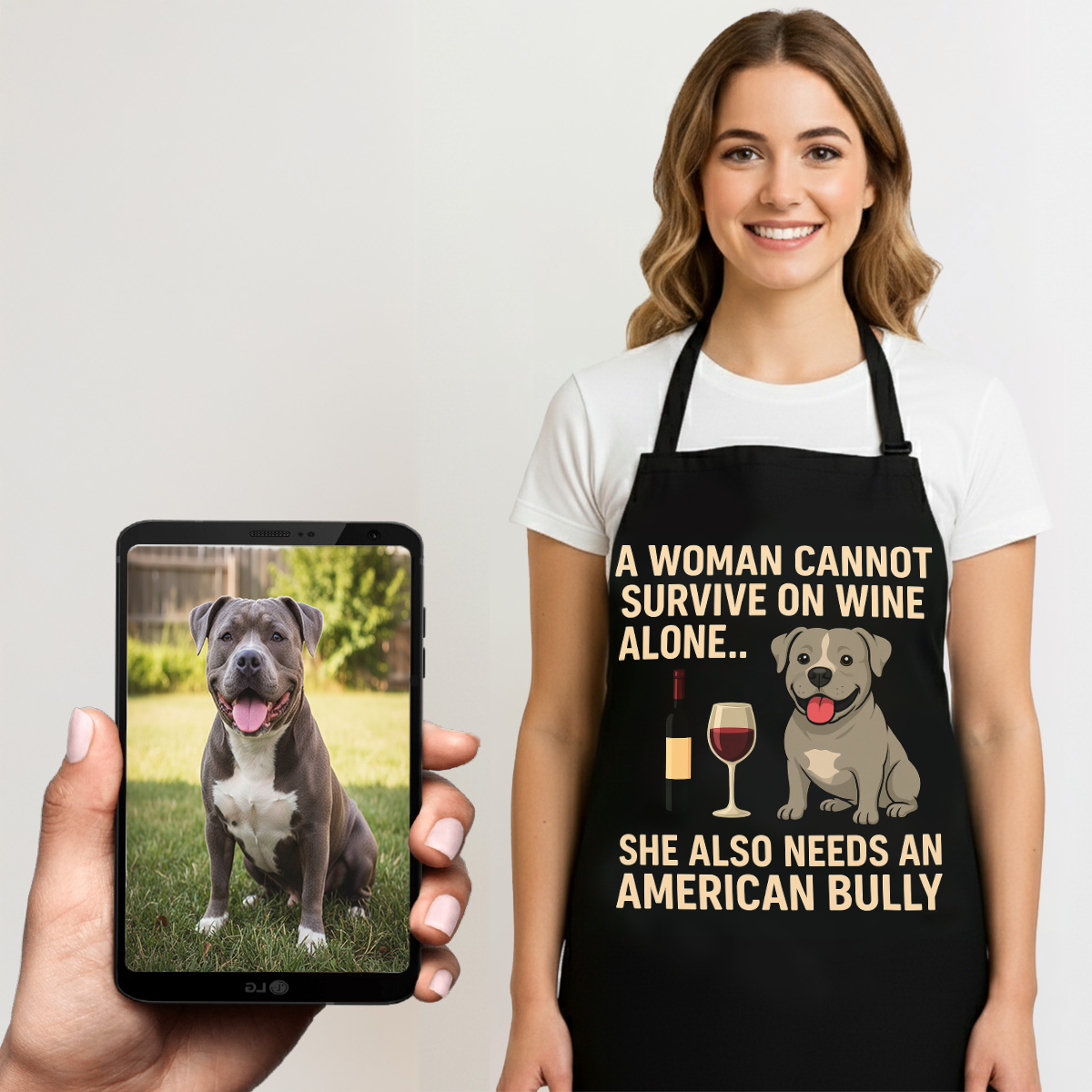 Celebrate your love for your American Bully with our Personalized “A Woman Cannot Survive on Wine Alone… She Also Needs a American Bully” Custom Dog Apron. This unique apron is perfect for dog lovers who enjoy cooking or entertaining while showcasing their bond with their furry friend.