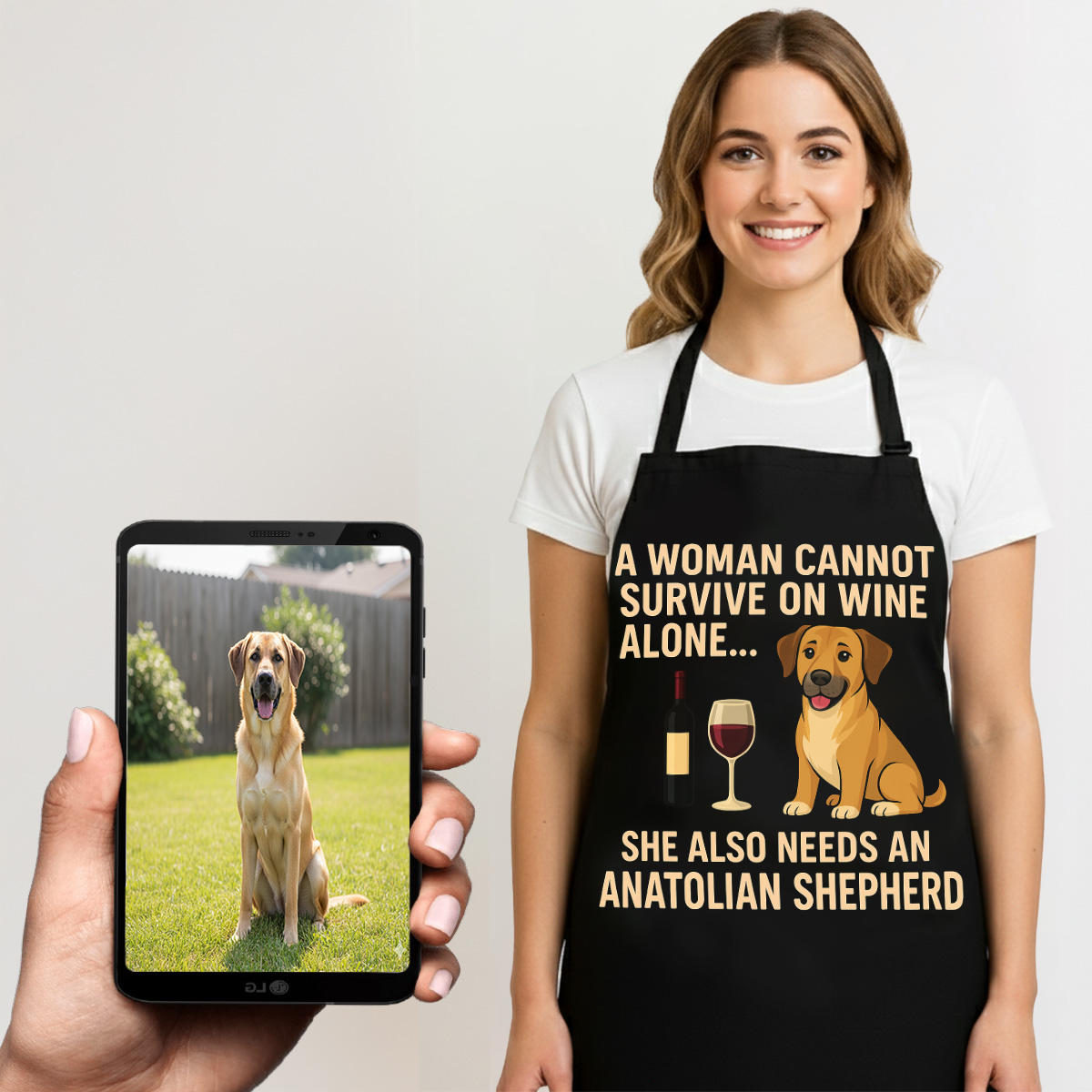 Celebrate your love for wine and your Anatolian Shepherd with our Personalized “A Woman Cannot Survive on Wine Alone… She Also Needs a Anatolian Shepherd” Custom Dog Apron. This unique apron is perfect for dog lovers who enjoy cooking or entertaining while showcasing their bond with their furry friend.