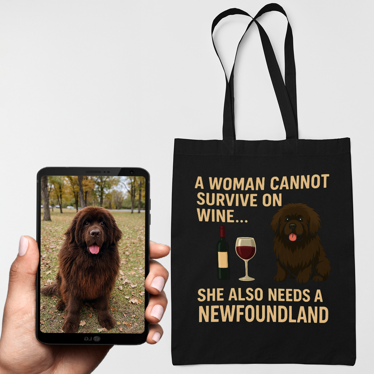 Personalized “A Woman Cannot Survive on Wine…” Custom Newfoundland Tote Bags-Accessories-Accessories,Bags,Dog Mom Gifts,Newfoundland,Personalize Artwork-1