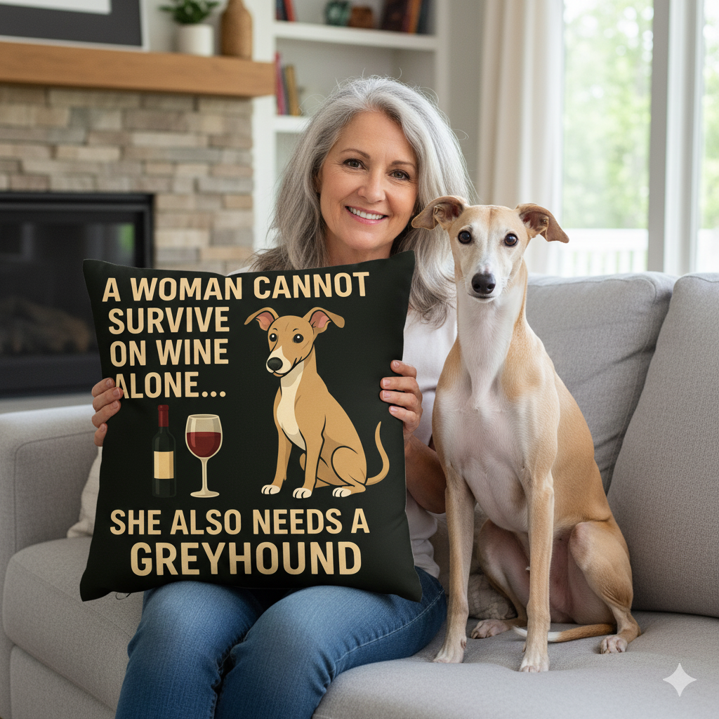 Personalized “A Woman Cannot Survive on Wine…” Greyhound Pillowcase-Home Decor-Dog Mom Gifts,Greyhound,Home Decor,Personalize Artwork,Pillows-1