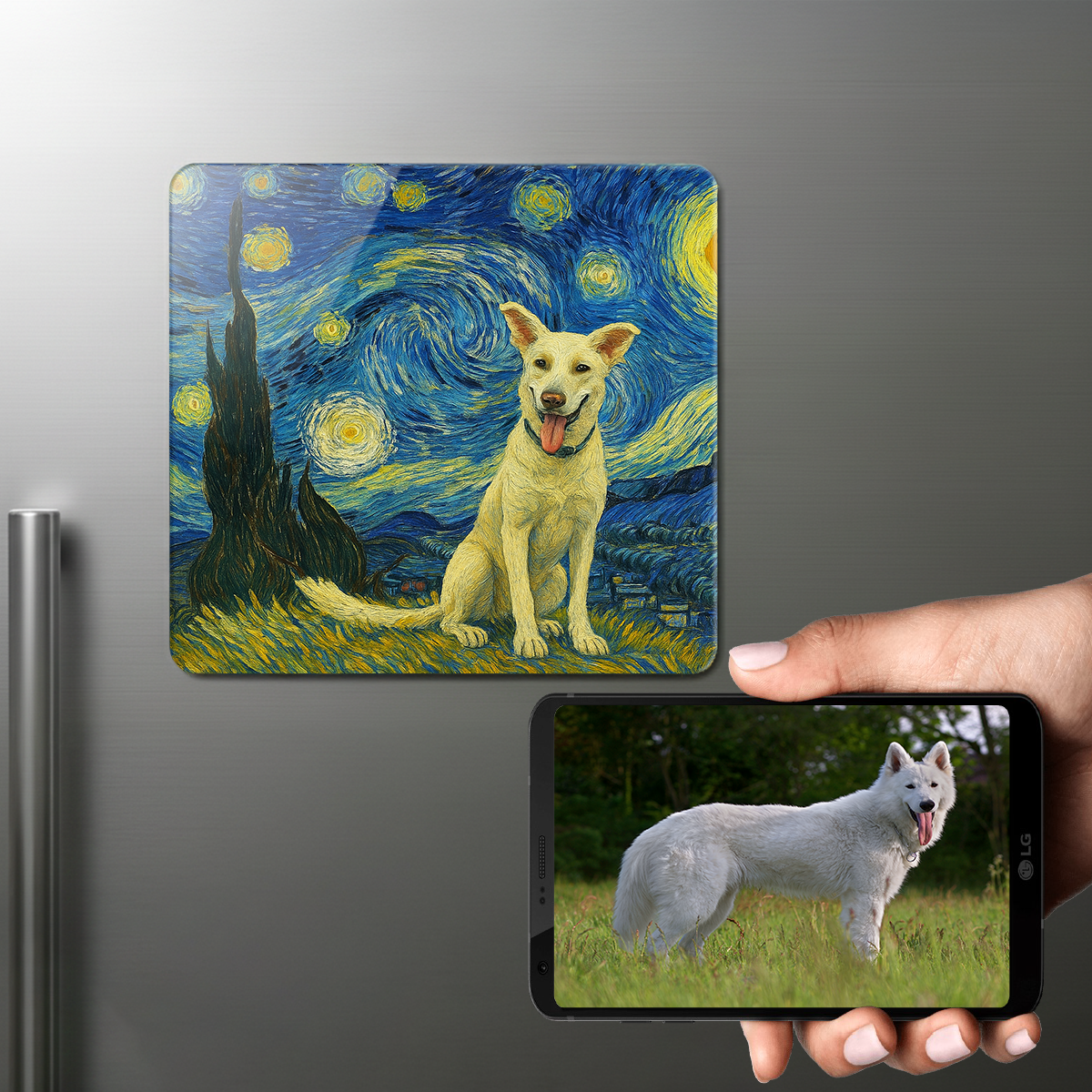 Transform your love for your White Swiss Shepherd into a stunning piece of art with our Personalized Starry Night Artwork — Custom Dog Fridge Magnet. This unique magnet captures the essence of your furry friend, bringing joy to your kitchen every day.