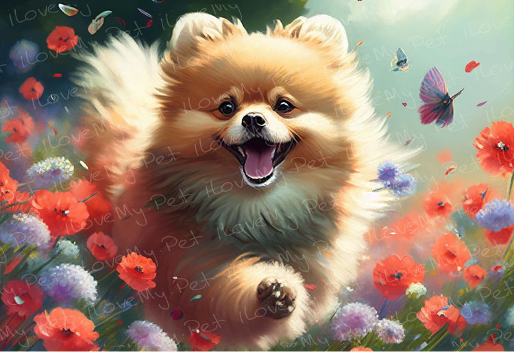 This exquisite piece captures the joyful essence of the Pomeranian, renowned for its fluffy coat and lively personality. The artwork features the exuberant expression of a Pomeranian set against a backdrop of colorful flowers.