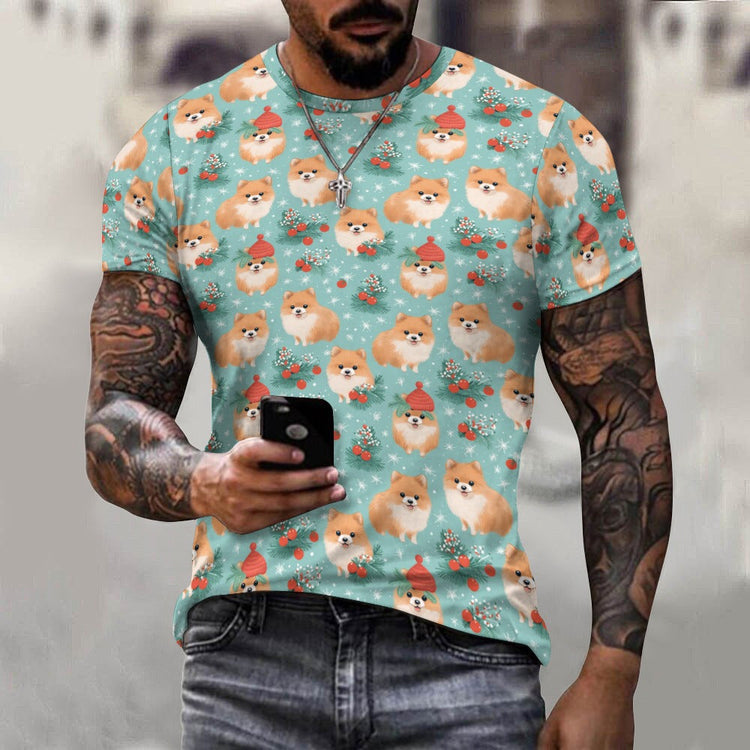 This t-shirt features a whimsical winter wonderland design, where cheerful Pomeranians frolic amidst a flurry of snowflakes. One even dons a festive red hat, capturing the joy and magic of the season. It's a heartwarming piece that brings the playful spirit of Pomeranians to life.