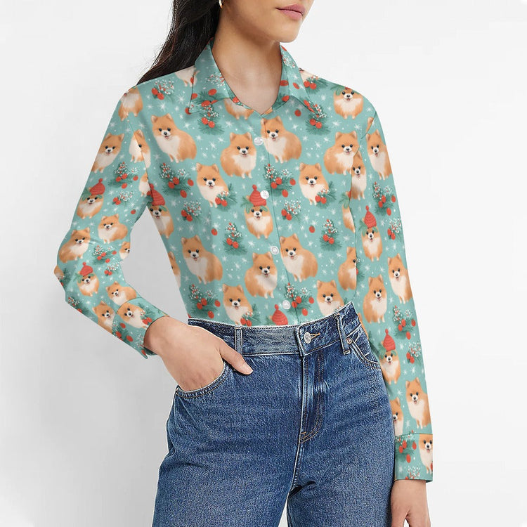 This shirt features a winter wonderland where cheerful Pomeranians frolic amid snowflakes. Their eyes sparkle with the magic of the season, capturing joy and curiosity.