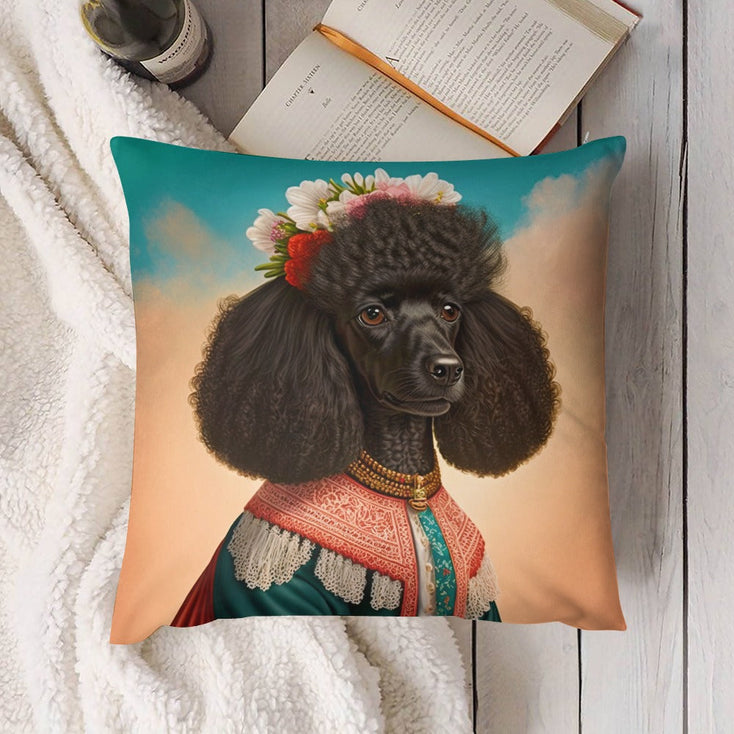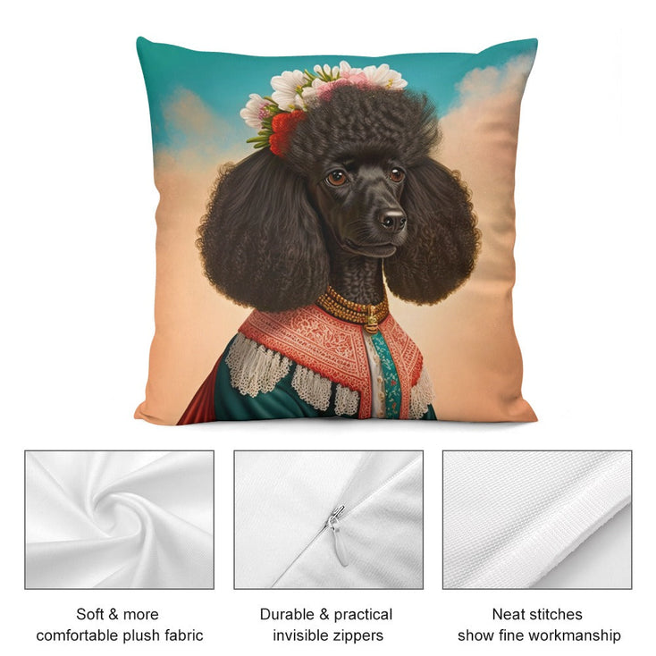 The golden necklace and floral headpiece add a touch of wealth, distinction, and pastoral charm, making this Poodle Pillow case a delightful fusion of history, art, and pet love.