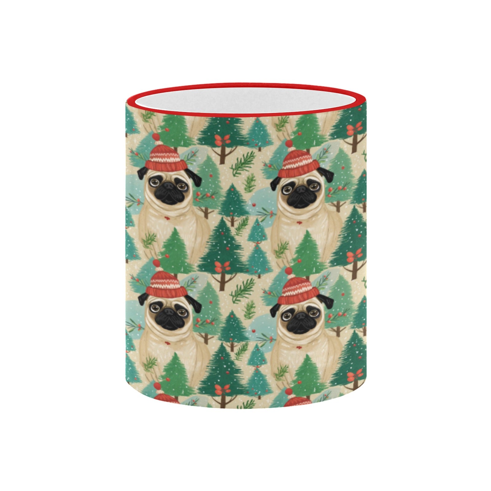 This charming mug features adorable Pugs in cozy winter hats, set against a serene backdrop of pine trees and seasonal foliage.